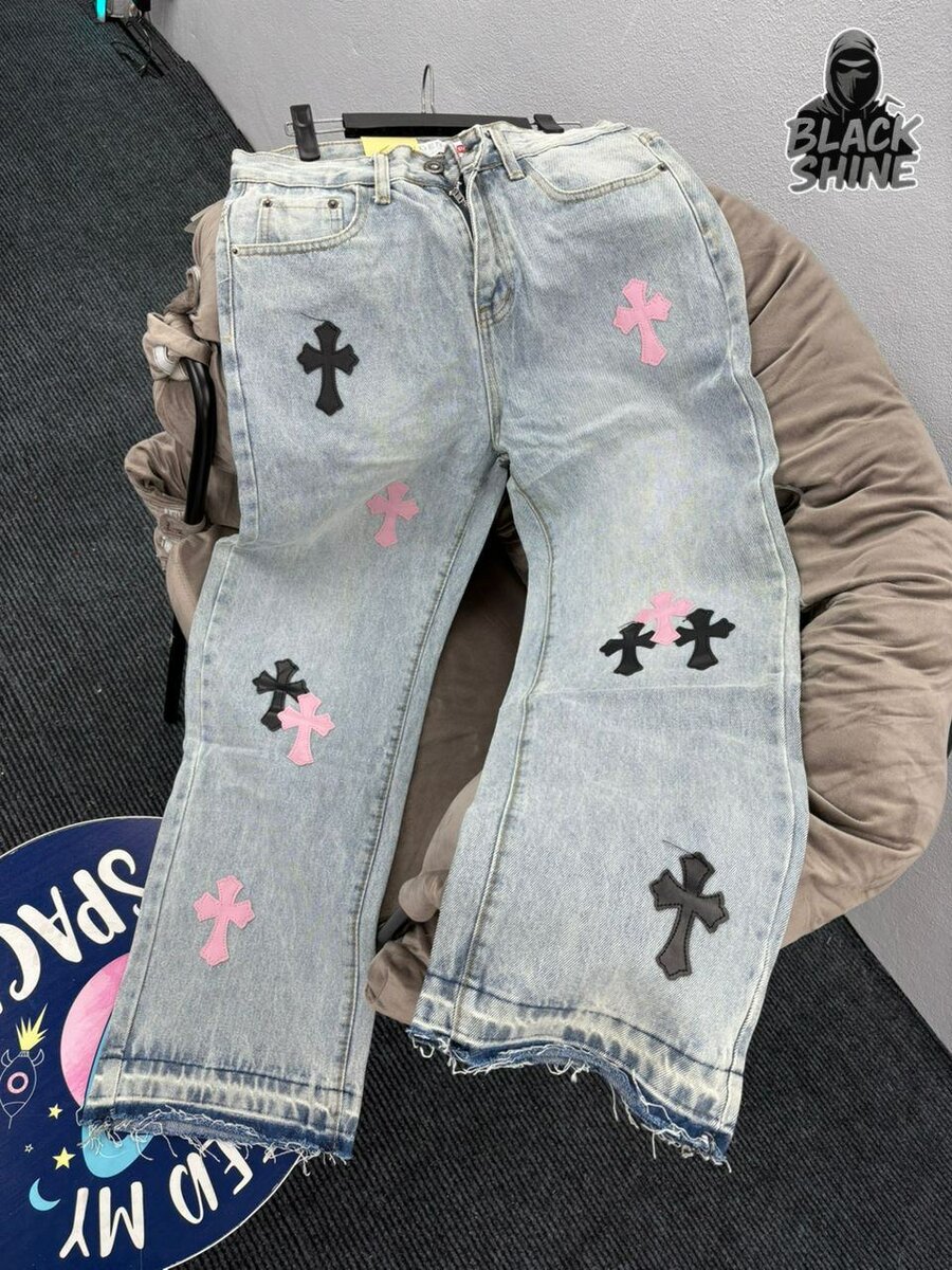 Découvrez ce jean homme tendance avec un design unique de croix roses et noires. Parfait pour un look streetwear audacieux, il allie confort et style. Portez-le en ville ou lors de sorties décontractées pour un impact maximal.