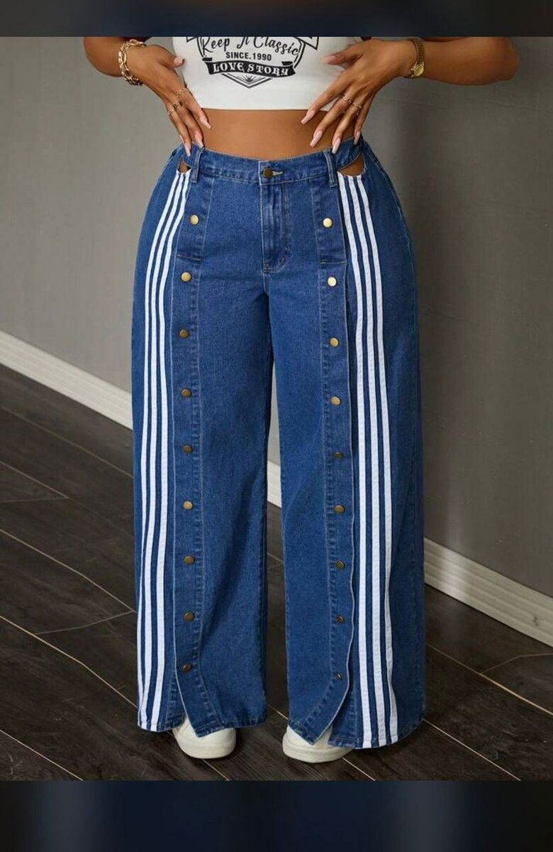 Découvrez ce pantalon en jean large avec des bandes blanches sur les côtés, parfait pour un style décontracté et tendance. Conçu pour les femmes qui aiment la mode et le confort.
