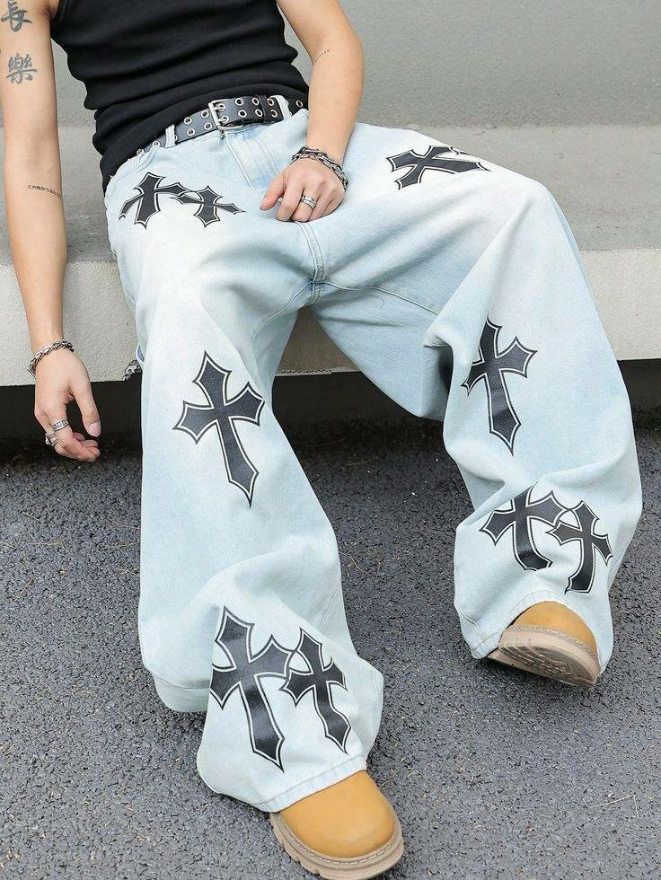 Découvrez ce jean large à motif de croix gothiques, idéal pour un look audacieux et tendance. Confortable et stylé, il s'accorde parfaitement avec des tenues décontractées ou alternatives. Sa coupe ample offre une grande liberté de mouvement, tandis que son design unique attire tous les regards. Parfait pour un style urbain et original.