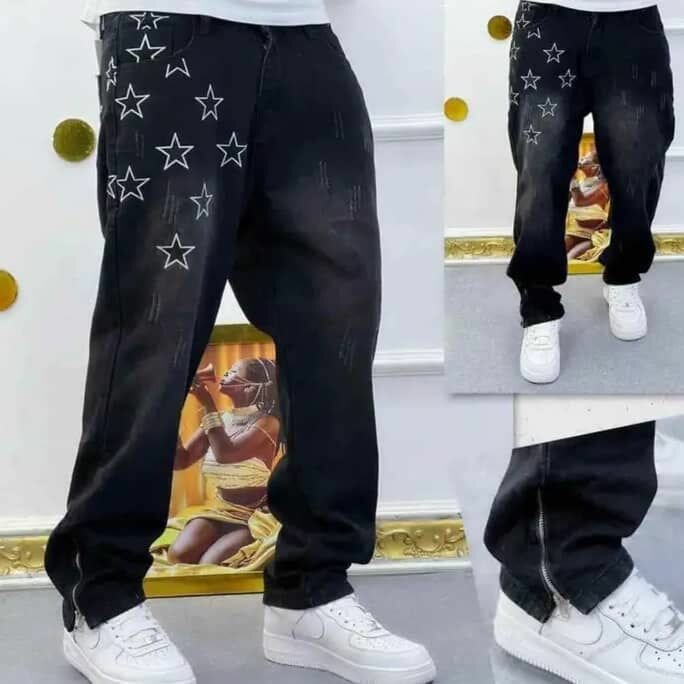 Découvrez ce jean noir tendance orné d'étoiles, parfait pour un look urbain chic. Confortable et polyvalent, il est idéal pour toutes vos sorties en ville. Associez-le avec vos baskets préférées pour un style décontracté.