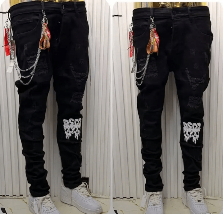 Découvrez ce jean noir au style streetwear audacieux, parfait pour ceux qui aiment se démarquer. Conçu avec des chaînes uniques et des détails déchirés, ce pantalon est idéal pour un look urbain. Fabriqué en matière résistante, il offre à la fois confort et durabilité. Portez-le avec des sneakers pour un style totalement tendance.