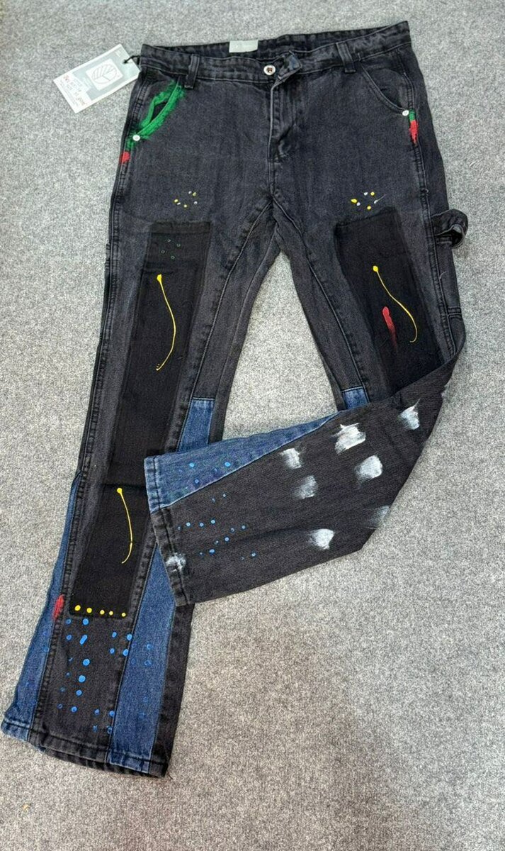 Exprimez votre style unique avec ce jean patchwork artistique. Conçu pour les esprits créatifs, il allie confort et mode avec ses motifs éclaboussés de peinture. Parfait pour un look décontracté et audacieux!