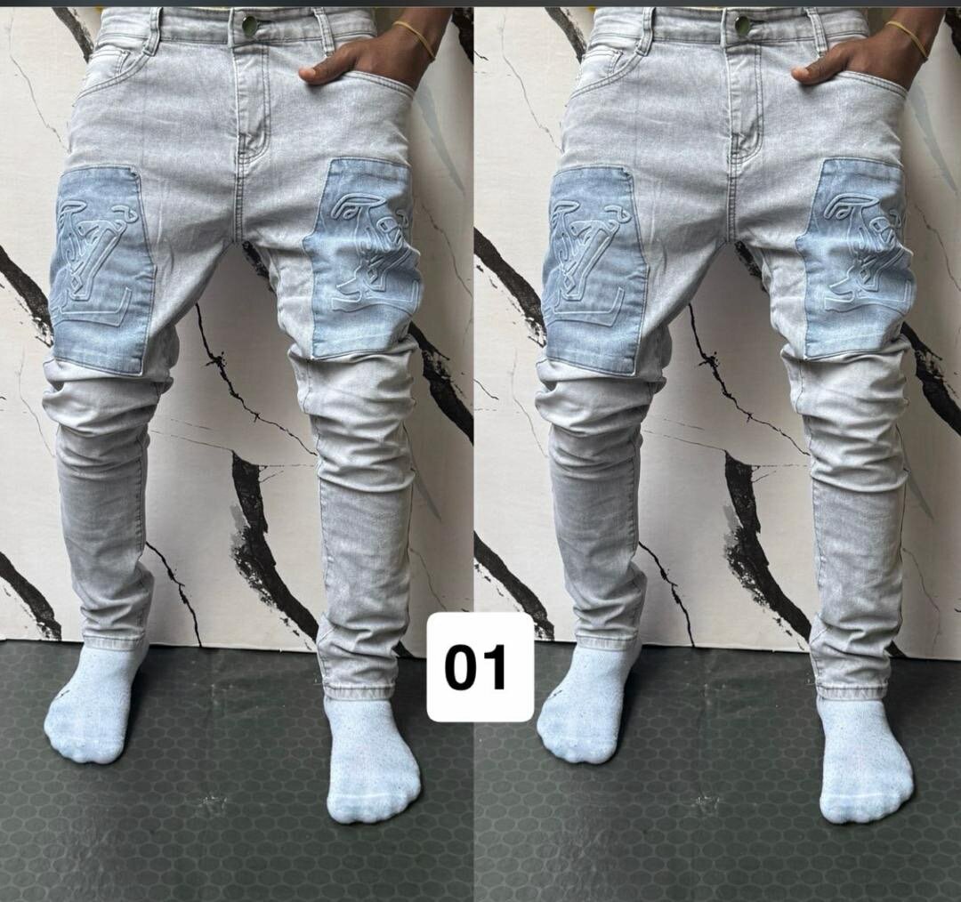 Jean slim gris avec patchs contrastés. Idéal pour un look décontracté et stylé. Tissu confortable et durable pour une utilisation quotidienne. Parfait avec des baskets ou des bottes.