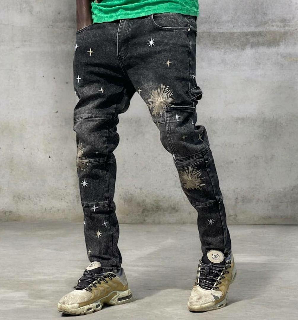 Jean slim noir tendance avec motifs étoilés audacieux, idéal pour un look urbain. Confortable et stylé, parfait pour soirées et sorties décontractées. S'accorde facilement avec un t-shirt ou une chemise. Une pièce unique pour affirmer votre style.