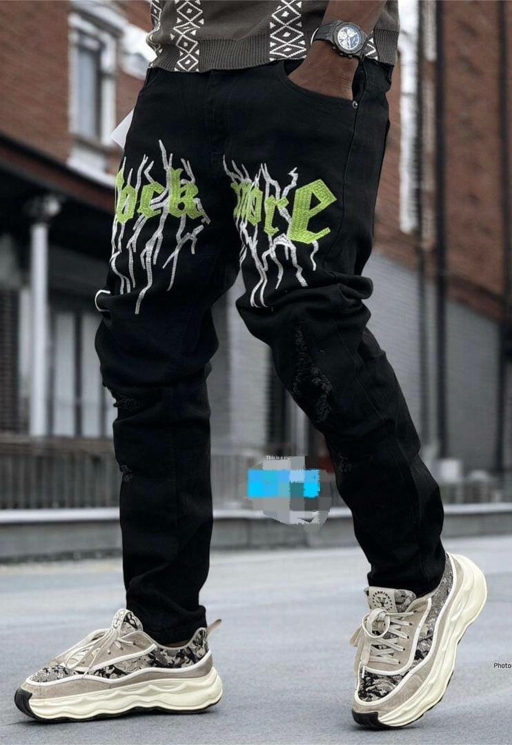 Optez pour un style urbain unique avec ce jean streetwear orné de motifs graffiti audacieux. Idéal pour les amateurs de mode urbaine, ce jean offre un ajustement confortable et un design percutant qui ne passera pas inaperçu. Parfait pour un look décontracté et tendance.