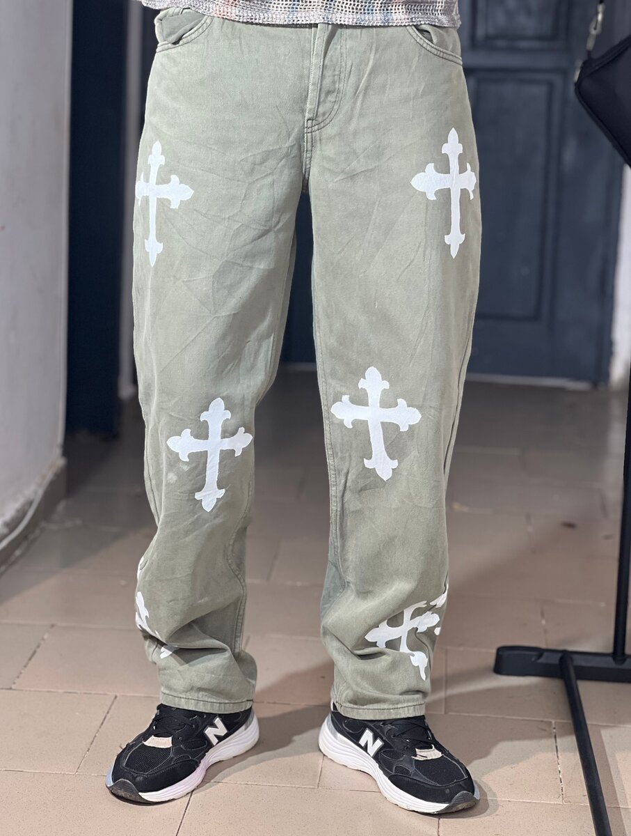 Renouvelez votre garde-robe avec ce jean unique orné de croix. Parfait pour une tenue décontractée avec une touche d'originalité.