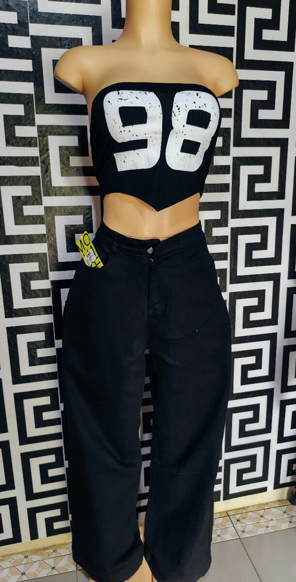 Ensemble jean's et top court noir "98" pour femme, design moderne et sportif, idéal pour un look tendance. Parfait pour les sorties ou les événements décontractés. Matière confortable et légère.