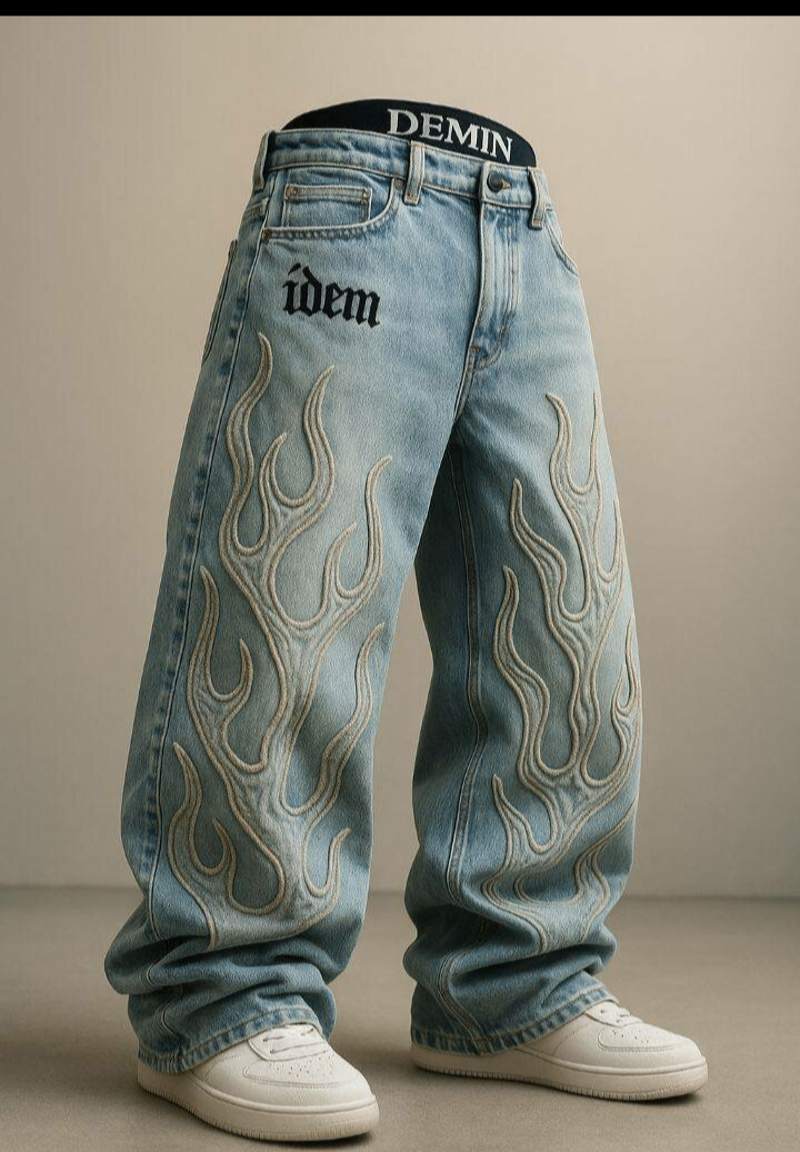 Démarquez-vous avec ces jeans baggy stylés arborant un motif de flammes audacieux. Parfait pour une allure urbaine moderne, ils offrent confort et originalité. Idéal pour les sorties décontractées ou les occasions spéciales. Fait en denim de haute qualité, c'est un choix durable et unique pour toute garde-robe.