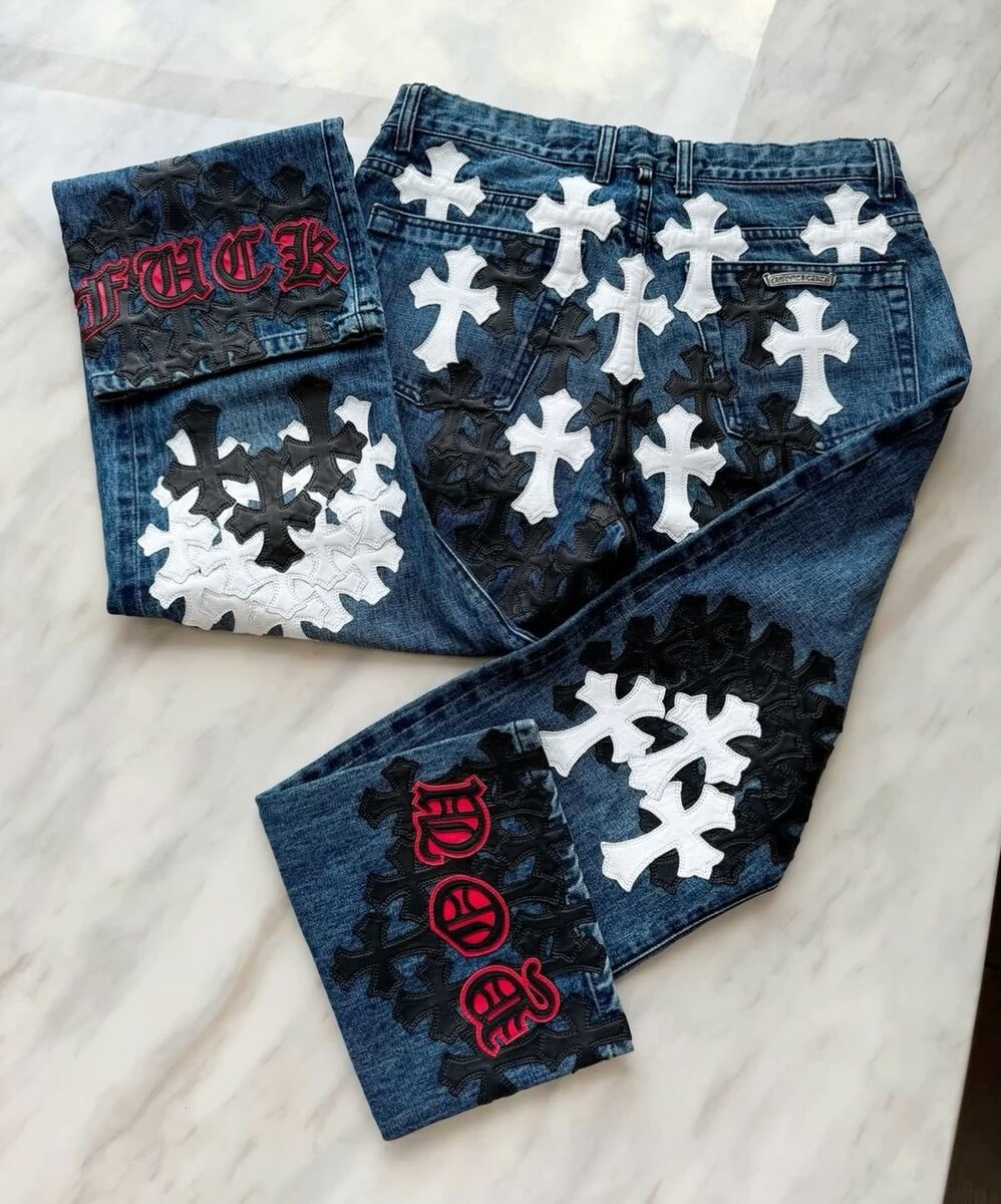 Découvrez ces jeans brodés au style grunge unique et captivant. Parfaits pour exprimer votre personnalité, ils présentent des motifs de croix et des détails colorés, ajoutant une touche audacieuse et originale à votre tenue. Idéals pour un look urbain décontracté ou rock, ils sont confectionnés dans un denim confortable et résistant. Ces jeans sont le choix parfait pour ceux qui osent se démarquer avec style.