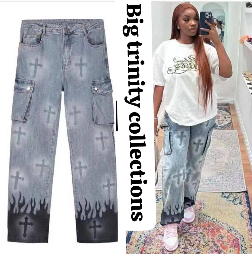 Découvrez notre jean cargo tendance avec impressions croix et flammes. Parfait pour un look urbain et audacieux, il allie confort et style. Idéal pour les sorties décontractées ou les tenues streetwear élégantes. Disponible en tailles variées.