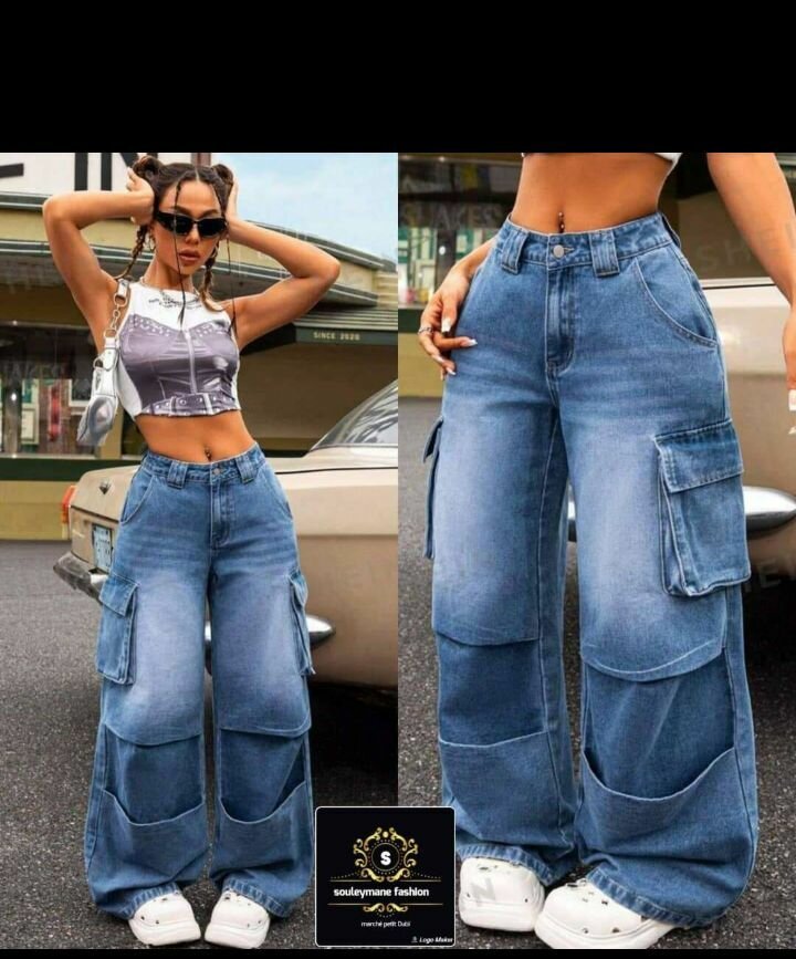 Jeans cargo pour femme, design ample et confortable. Poches latérales, style décontracté et tendance. Conçu pour un look moderne et un confort optimal.