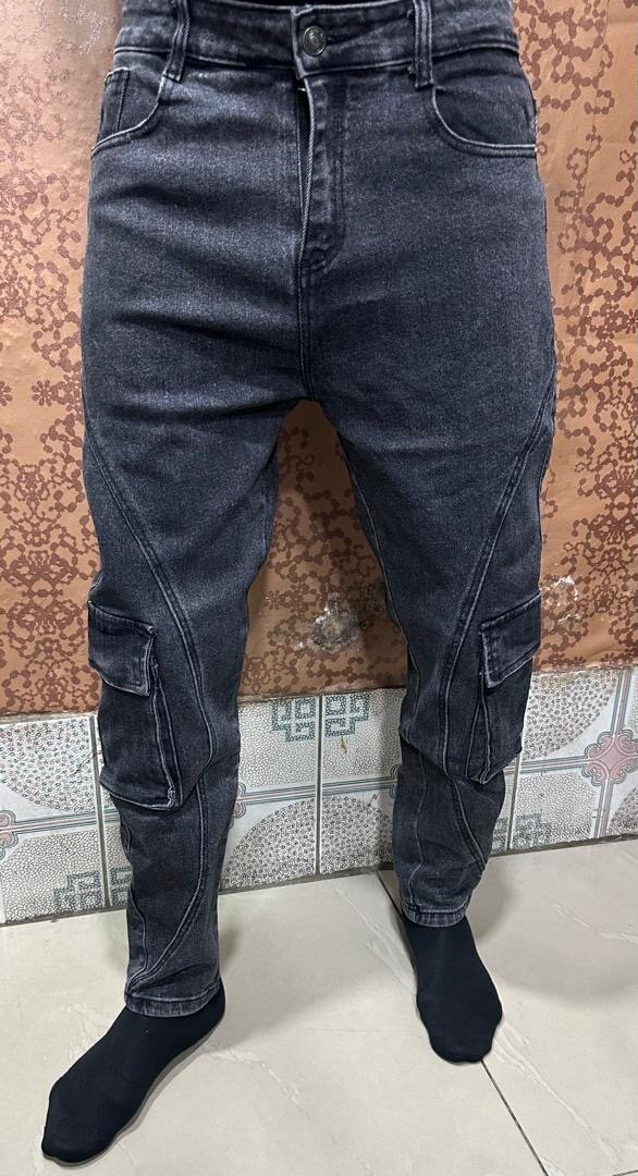 Jeans cargo pour homme, noir délavé, confortable et résistant. Poches latérales pratiques.
