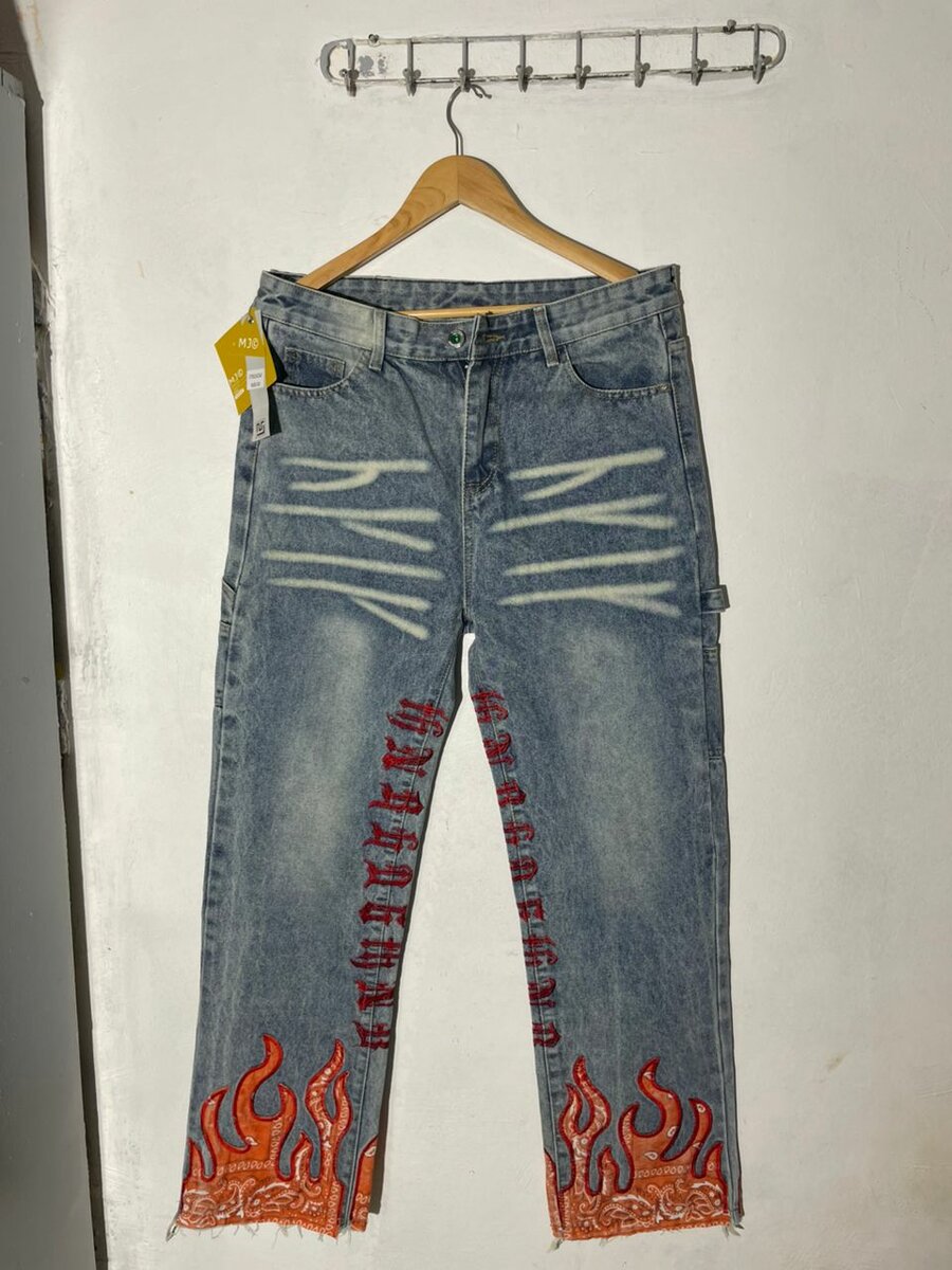 Exprimez votre individualité avec ce jean déchiré unique orné de motifs flammes flamboyants. Idéal pour ceux qui aiment un style audacieux et décontracté. Fabriqué en denim de haute qualité pour un confort durable. Parfait pour les sorties en ville ou un style casual tendance.