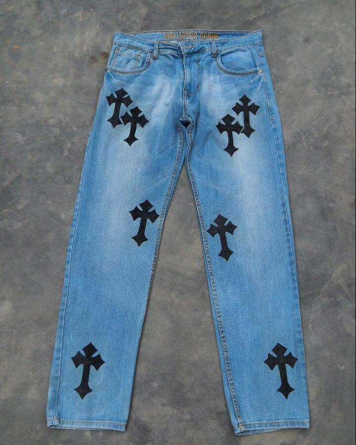 Découvrez ces jeans en denim ornés de motifs croix noirs, parfaits pour un style unique et audacieux. Confortables et résistants, ces jeans deviennent un incontournable pour ceux qui aiment se démarquer. Idéal pour le quotidien ou des occasions spéciales, ils s'associent facilement avec un t-shirt ou une veste en cuir.