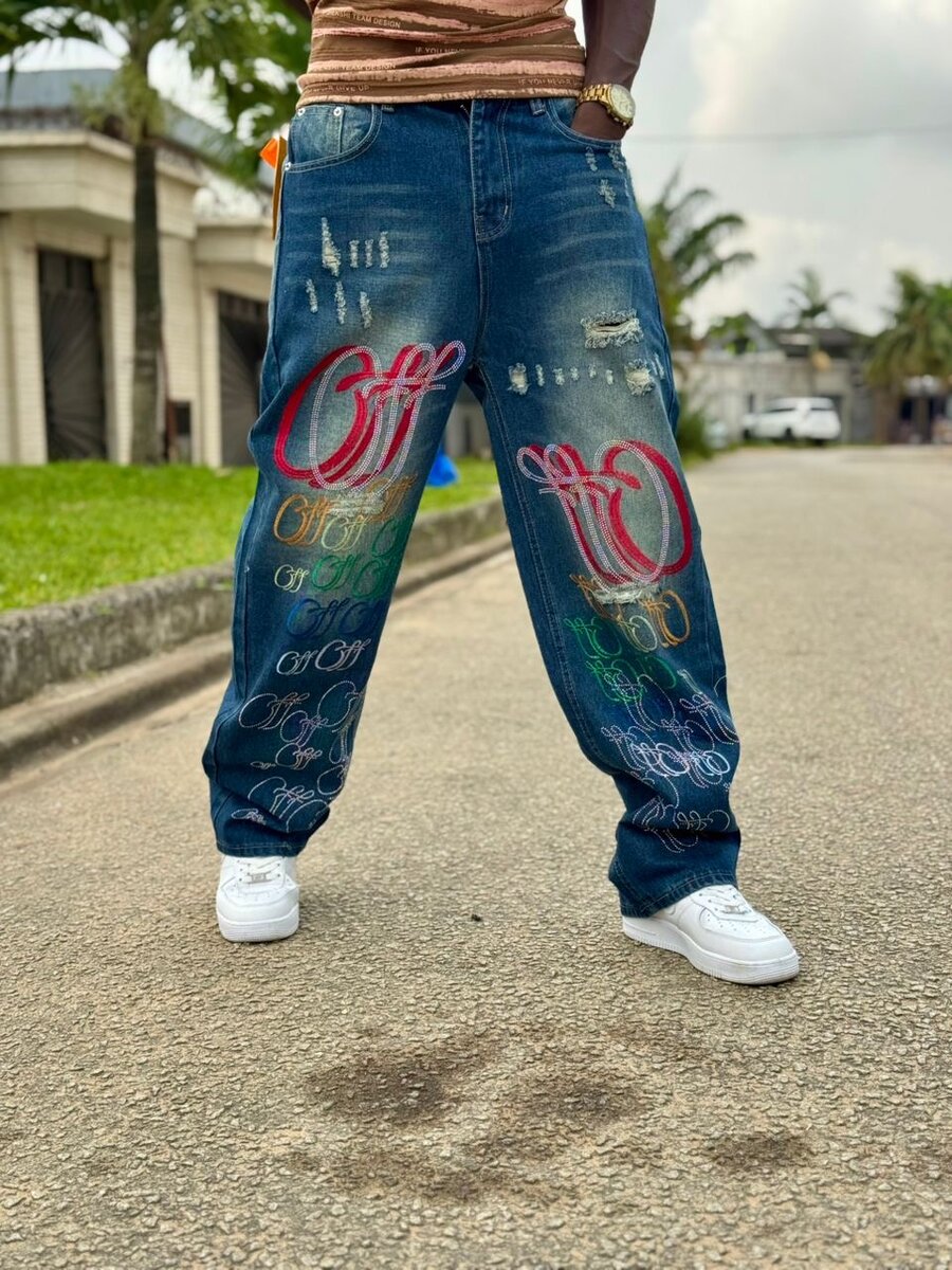 Découvrez ces jeans décontractés pour homme, personnalisés avec des motifs uniques et une touche de style Off-White. Parfaits pour un look urbain et tendance.