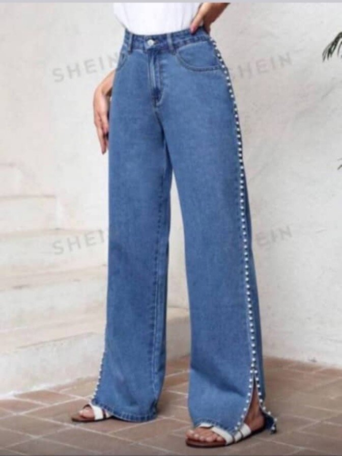 Découvrez ces jeans larges pour femme avec une décoration de perles élégante le long des côtés. Fabriqués en denim de haute qualité, ils offrent un confort tout en étant stylés. Idéal pour un look casual chic, ces jeans s'adaptent facilement à différentes tenues, parfaits pour une sortie entre amis ou une journée décontractée.