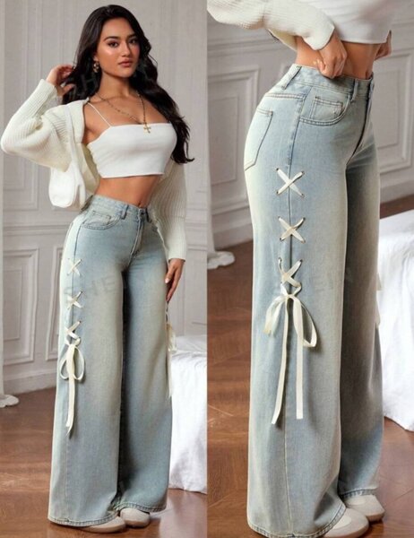 Jeans larges pour femme avec détails de rubans roses. Style confortable et tendance. Tissu denim de qualité.