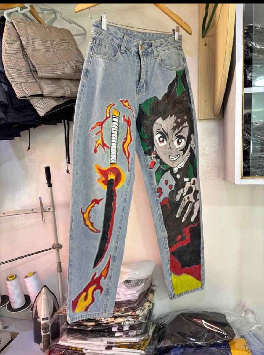 Exprimez votre passion pour l'anime avec ces jeans uniques peints à la main, featuring un design inspiré par Demon Slayer. Parfaits pour les fans et les amateurs de mode alternative, ces jeans offrent confort et style distinctif, idéals pour toute sortie décontractée.