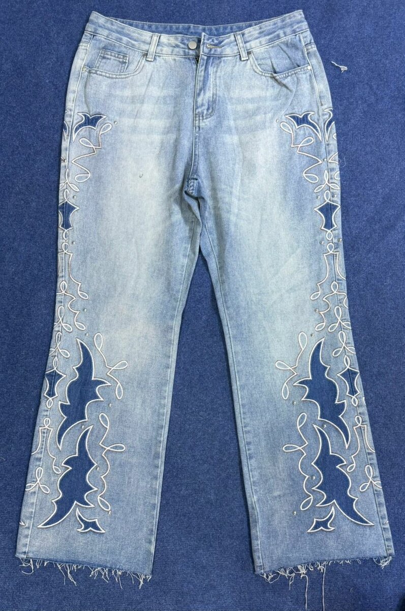 Découvrez ces jeans personnalisés avec des motifs uniques. Parfaits pour ceux qui veulent se démarquer, ces jeans allient confort et style original. Idéal pour un look urbain ou décontracté.