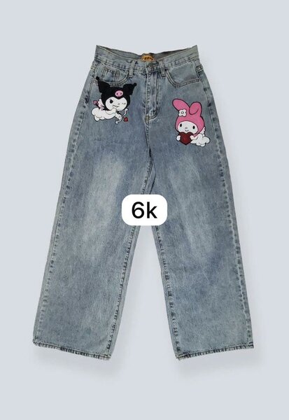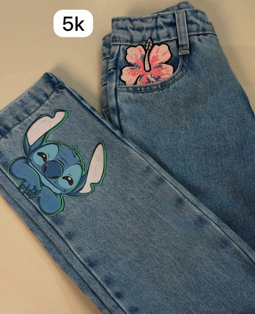 Jeans tendance pour enfants avec un motif amusant de personnage animé et fleur hibiscus. Confortable, durable et parfait pour un look stylé à l'école ou en sortie. Fabriqué en denim de haute qualité pour un confort tout au long de la journée.