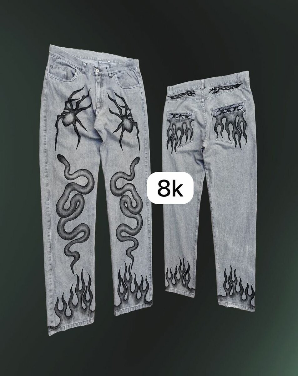 Découvrez ces jeans audacieux avec motifs de flammes et serpents, parfaits pour affirmer votre style unique. Fabriqués en denim robuste, ils allient confort et tendance pour un look intemporel. Idéals pour les fashionistas et les esprits libres, ajoutez une touche rebelle à votre garde-robe!