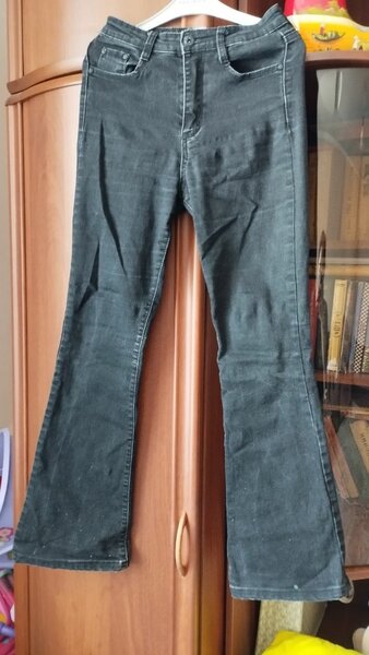 Эти джинсы расклёшенные, чёрного цвета с эффектом вываренного денима, что создаёт стильный винтажный вид. Они имеют завышенную талию, что подчёркивает фигуру и визуально удлиняет ноги.