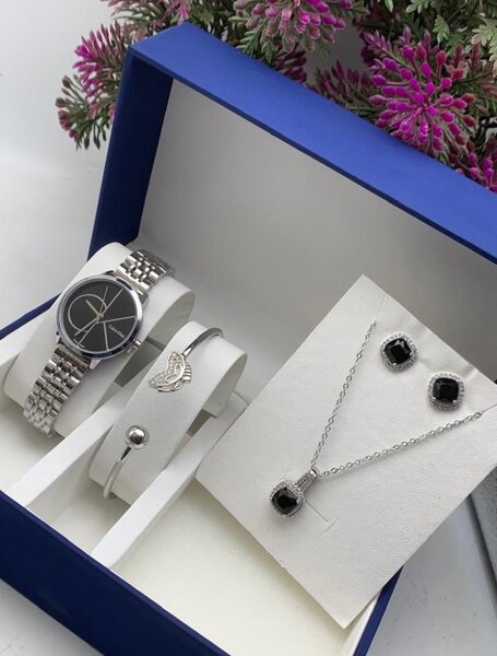 Simple but nice jewelry set , made up of a necklace, a pair of earrings and a bangle .