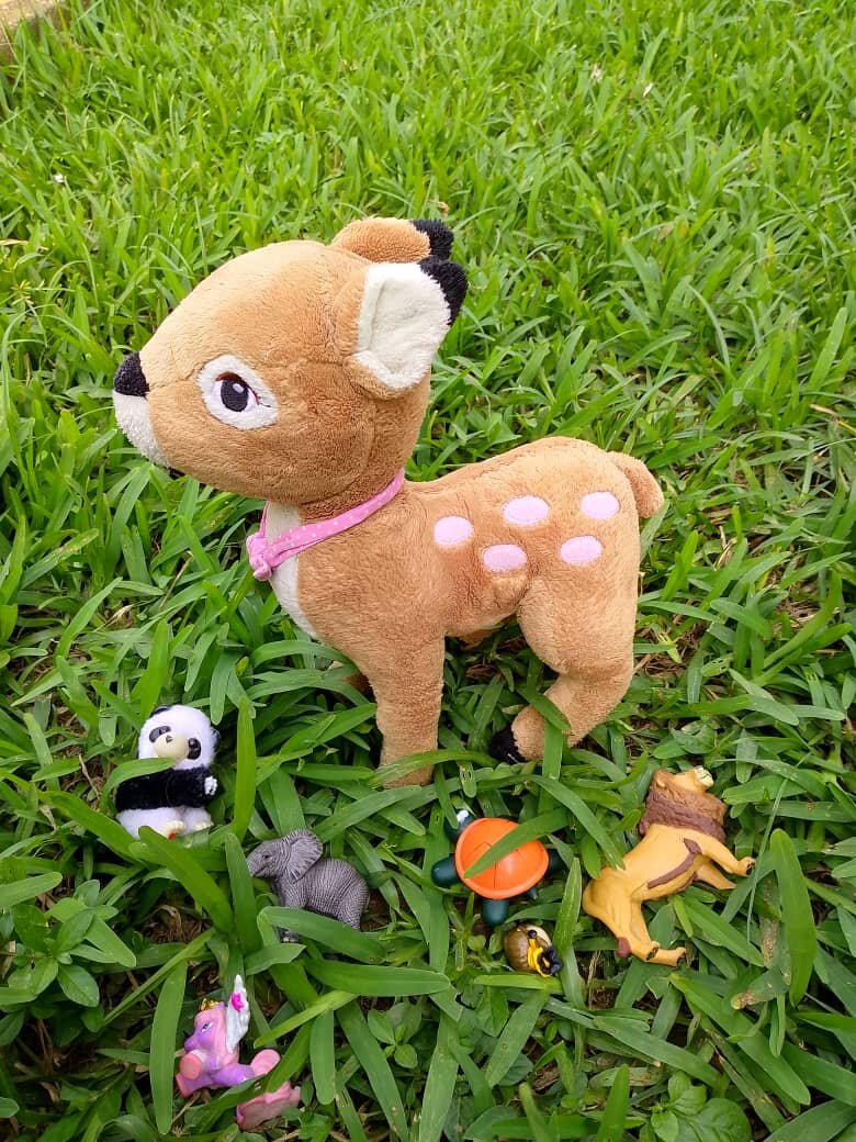 Un joli Bambi en peluche avec un collier rose, idéal pour les enfants. Ce jouet doux et câlin est parfait pour les petites filles et garçons qui adorent les animaux de la forêt.