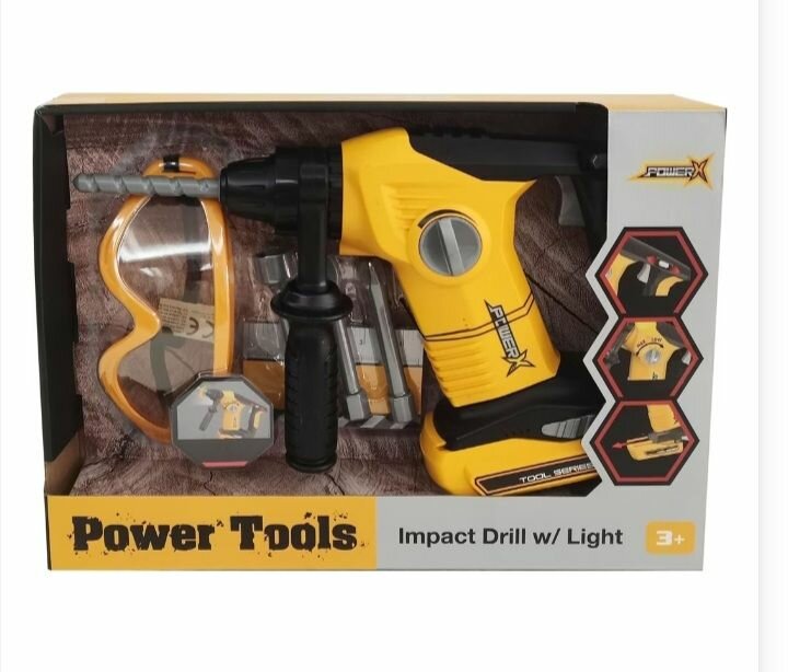 perceuse à percussion avec lumière, son et lunettes de protection ! Devenez un véritable artisan et réalisez des travaux manuels autour de la maison avec la perceuse sans fil Power X. À partir de 3 ans.