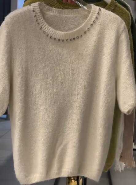 Свитер бежевого цвета с коротким рукавом, горловина украшена стразами