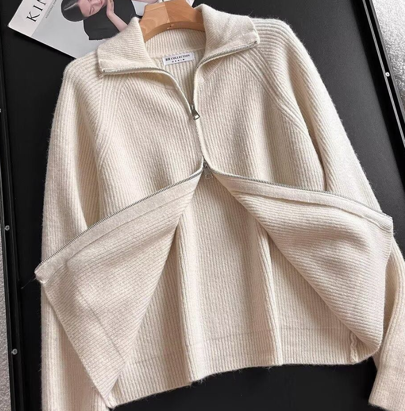 Дизайнерский вязаный кардиган с двойной молнией и лацканами для женщин осенью и зимой, свободный, облегающий повседневный короткий верх