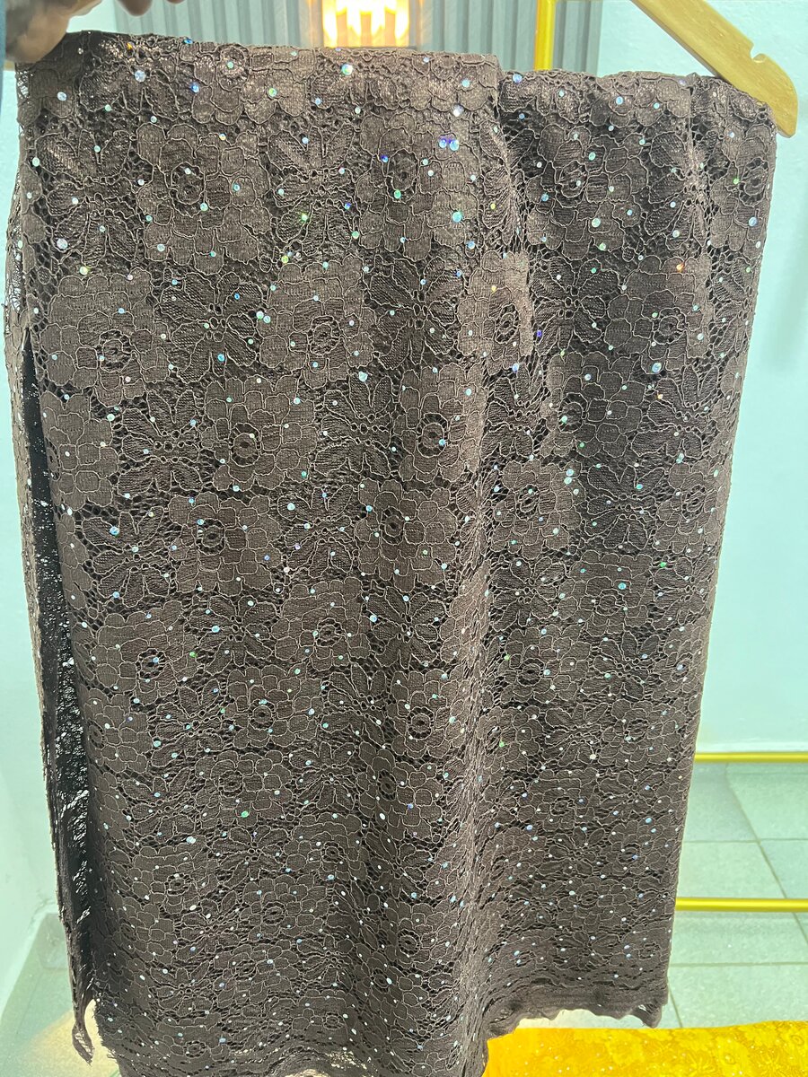 Découvrez cette élégante jupe en dentelle ornée de paillettes scintillantes, parfaite pour vos soirées spéciales. Confectionnée en tissu haut de gamme avec une coupe flatteuse, elle se marie idéalement avec un haut chic pour un look sophistiqué. Idéale pour des occasions festives ou des dîners élégants.