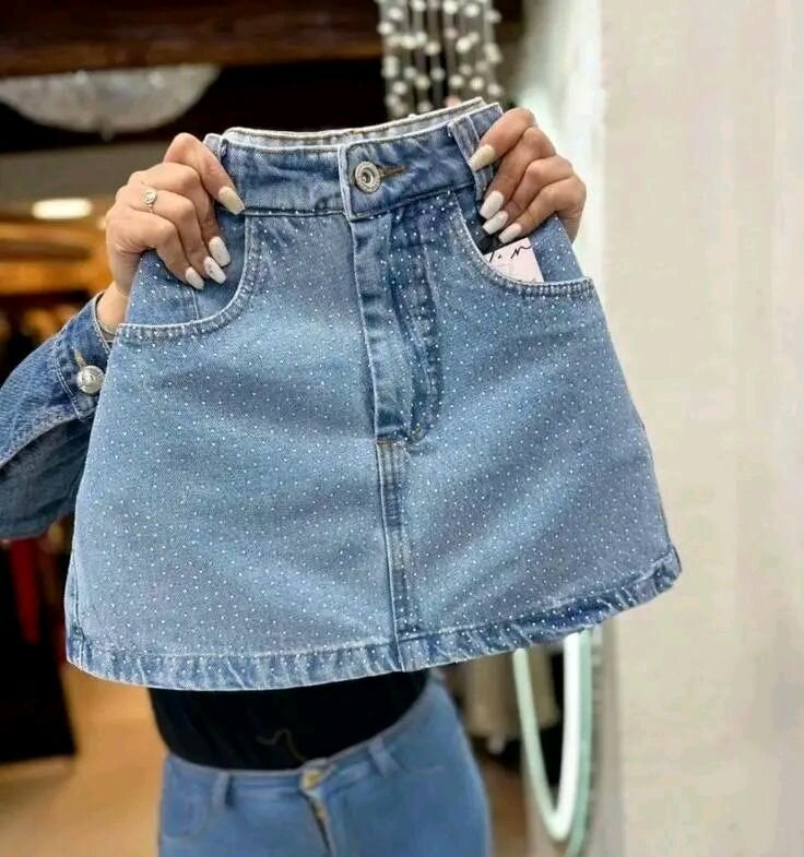 Une jupe en jean bleu clair avec des pois blancs, idéale pour un look décontracté et élégant. Confectionnée en denim de qualité, cette jupe est parfaite pour les sorties en ville ou les soirées décontractées.