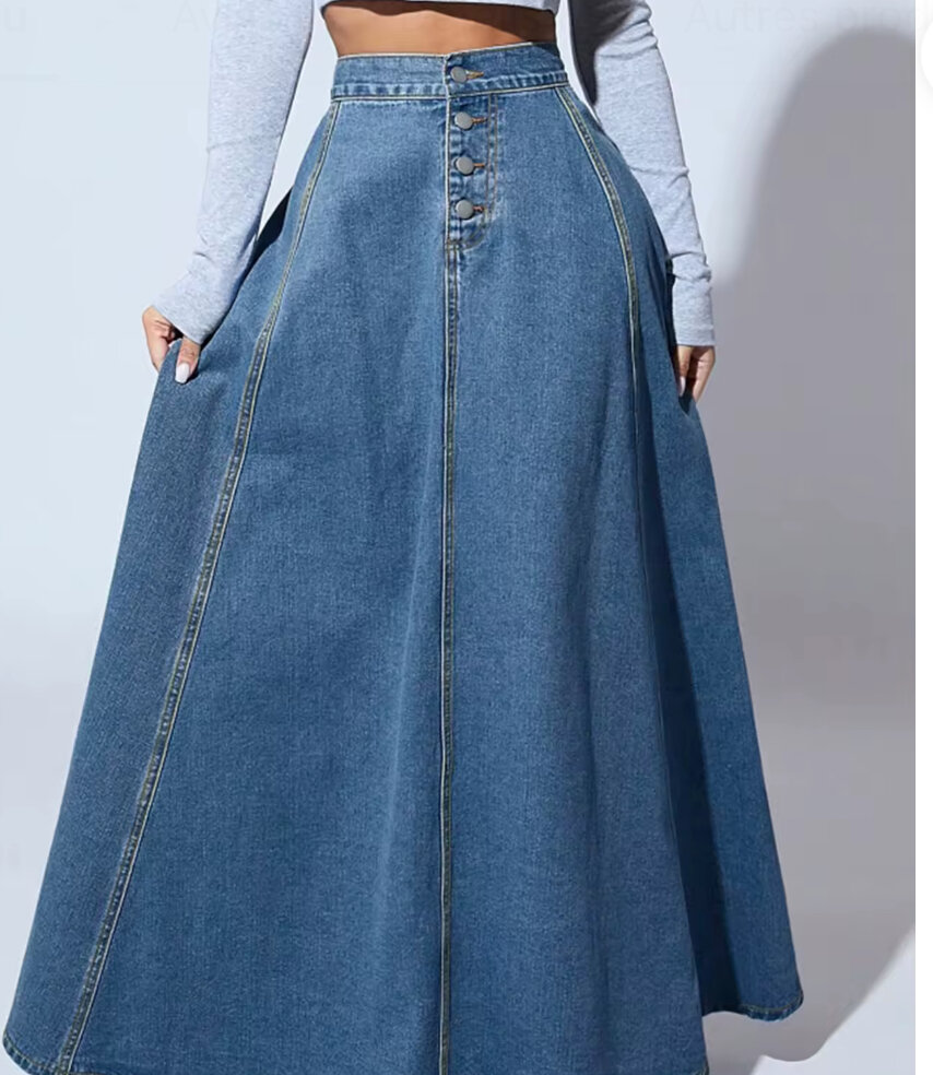 Découvrez cette jupe en jean longue et élégante pour un look décontracté mais chic. Parfaite pour toutes les saisons, elle s'adapte facilement à différents styles, se portant aussi bien avec des tops décontractés qu'avec des chemises plus formelles. Sa coupe ample facilite le mouvement tout en gardant une silhouette flatteuse. Idéale pour une sortie en ville ou une journée de détente.