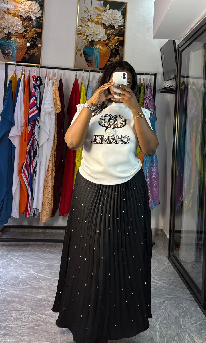 Découvrez cette jupe longue noire avec détails perles, parfaite pour un look chic et sophistiqué. Idéale pour toutes occasions, elle s'associe facilement à vos tenues préférées pour une touche d'élégance unique.