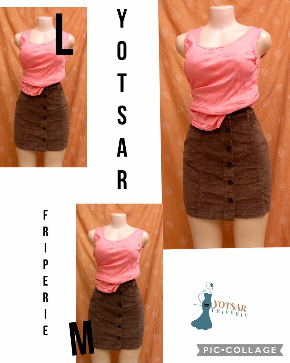 Découvrez cette élégante jupe en velours côtelé marron avec boutons en façade. Parfaite pour un look chic et décontracté, elle s'associe facilement avec des hauts colorés pour toutes les occasions. Disponible en tailles M, L, et XL.