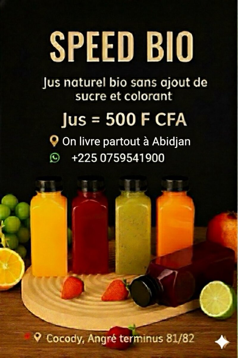 Dégustez nos jus bio naturels, sans sucre ajouté ni colorant artificiel. Parfaits pour une pause santé. Disponibles en plusieurs saveurs fraîches, idéales pour dynamiser votre journée!