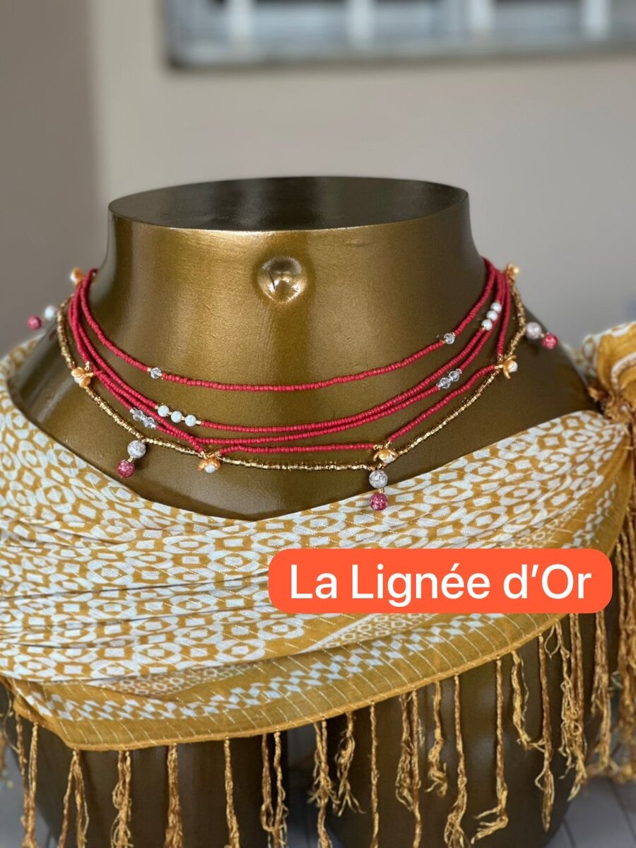 Kérène Rouge incarne laudace et la confiance absolue. Ses fils écarlates enlacent la taille avec la même intensité quun regard assuré, tandis que les perles dorées et nacrées diffusent une lumière noble et sensuelle.