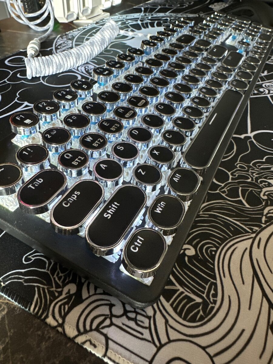 Механическая клавиатура noname hjk94, в виде печатной машинки, с синими свитчами, и регулируемой подсветкой. Подключение по usb проводу и bluetooth, адаптера нет. Новая.