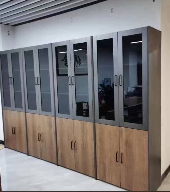 خزانة كتب خشبية أنيقة مع أبواب زجاجية مثالية للمكاتب أو غرف الدراسة. تتميز بتصميم عصري يجمع بين الخشب والزجاج لتوفير تخزين فاخر. يمكنها استيعاب الكتب والملفات والديكورات، مما يجعلها الخيار الأفضل لتنظيم المكان بشكل أنيق.