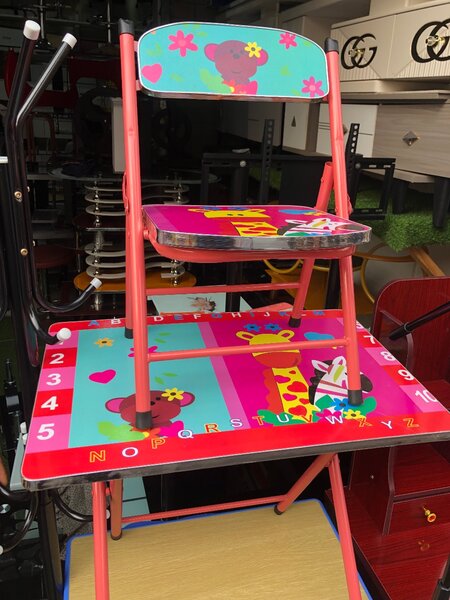 Kids table and chair. It's adjustable. As your child keeps growing, you can adjust the chair to suit their age. They can use it for a lifetime because it's high quality. It has a clock attached to it.