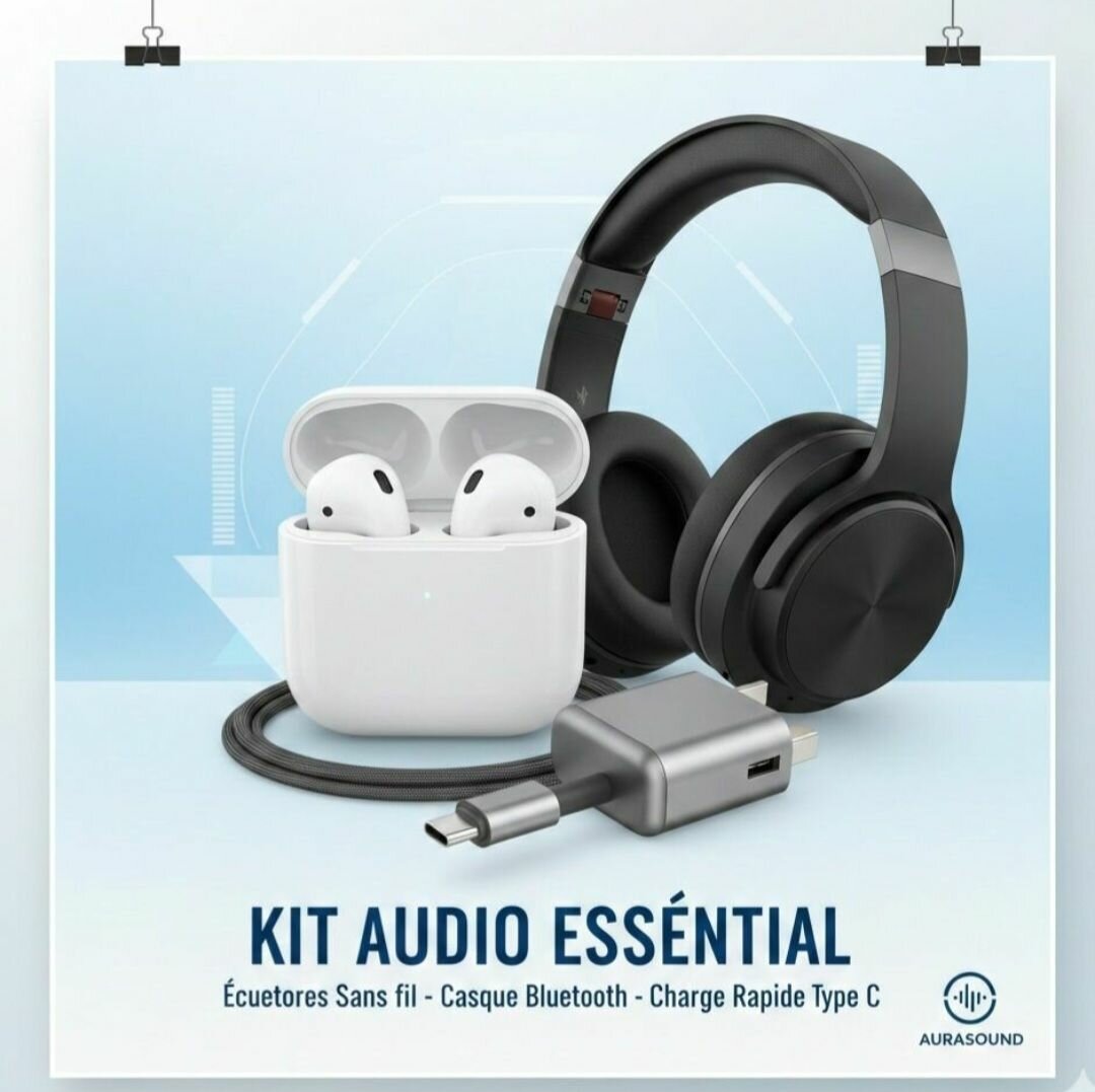 Découvrez le Kit Audio Essentiel avec casque Bluetooth, écouteurs sans fil et chargeur rapide Type-C. Parfait pour les amateurs de musique et les professionnels en déplacement.