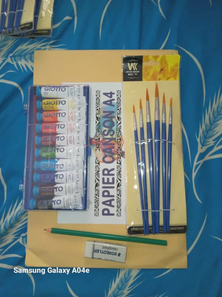 Profitez de votre créativité avec ce kit complet de peinture et dessin. Comprend papier Canson A4, pinceaux, crayons et peinture acrylique Giotto—parfait pour les artistes amateurs et confirmés.