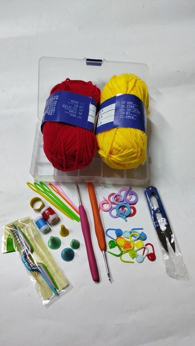 Kit Crochet pour Débutant composant Deux laines coton 50gram, 2 Crochets, aiguilles, ciseaux, marquers et bien d'autres accessoires essentiels pour le crochet et Tricot.