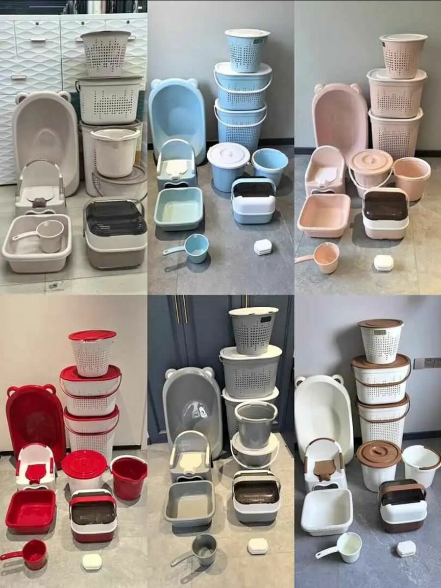 Ensemble polyvalent de bassines et paniers en polypropylène, idéal pour le rangement, le lessive et l'organisation domestique. Disponible en plusieurs couleurs modernes. Parfait pour une utilisation dans la buanderie ou la salle de bain.