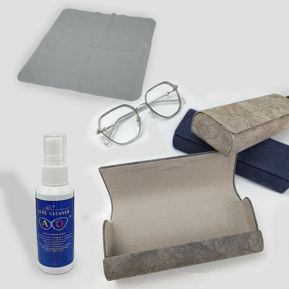 Kit complet pour lunettes comprenant un spray nettoyant, un chiffon doux et un étui élégant. Idéal pour maintenir vos lunettes propres et protégées au quotidien.
