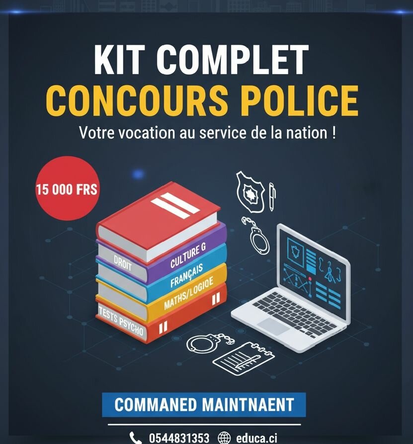 Préparez-vous efficacement avec notre kit complet pour le Concours de Police. Inclut des livres de droit, culture générale, français, mathématiques, et tests psychologiques. Idéal pour les aspirants policiers.