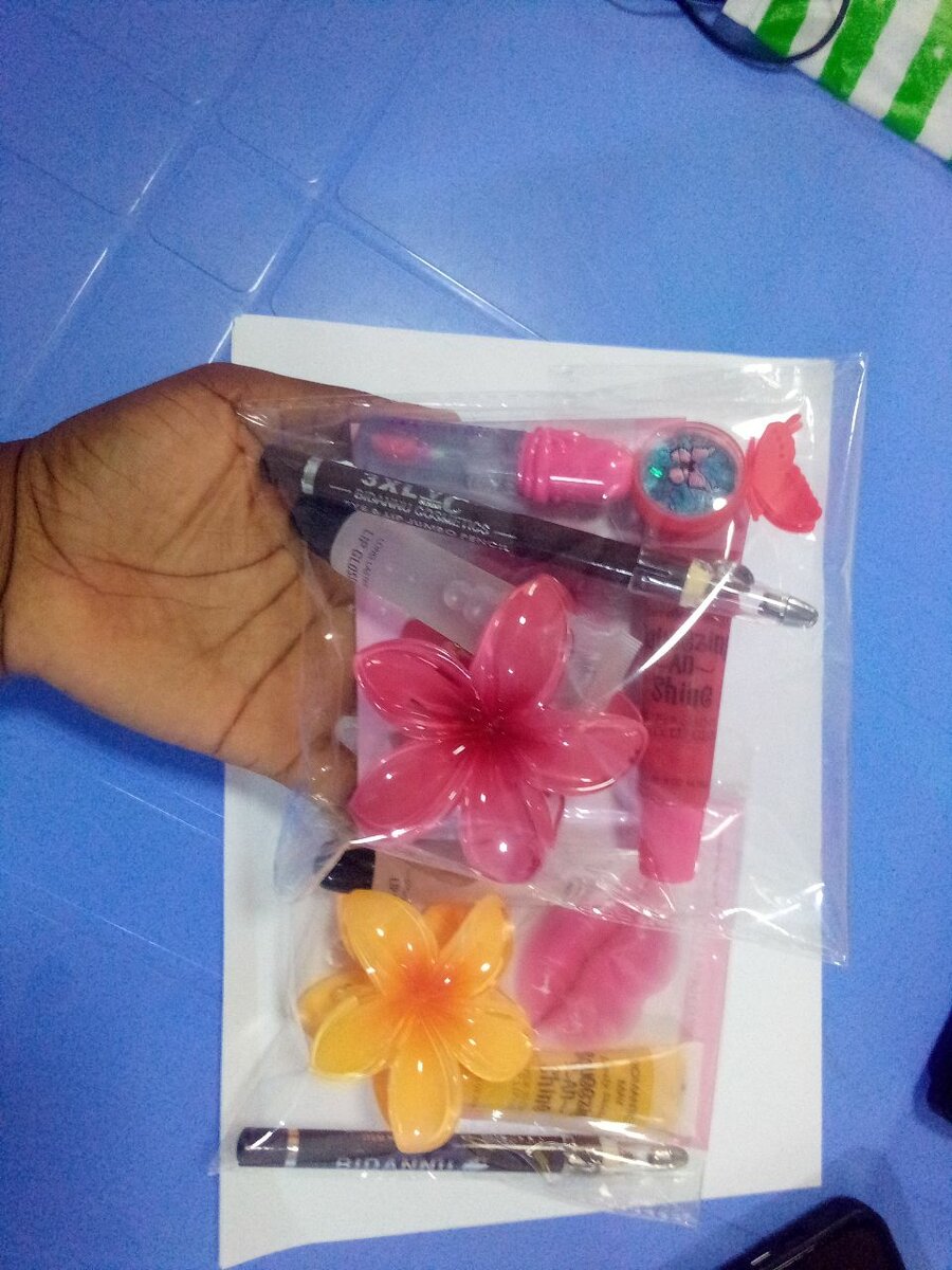 1 barrette à cheuveux, 1 crayon de beauté, 1 gloss sucré, 1 gloss etc