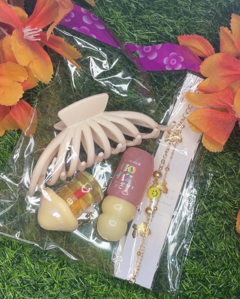Le kit est composé 2 gloss une chaîne une bague une barrette