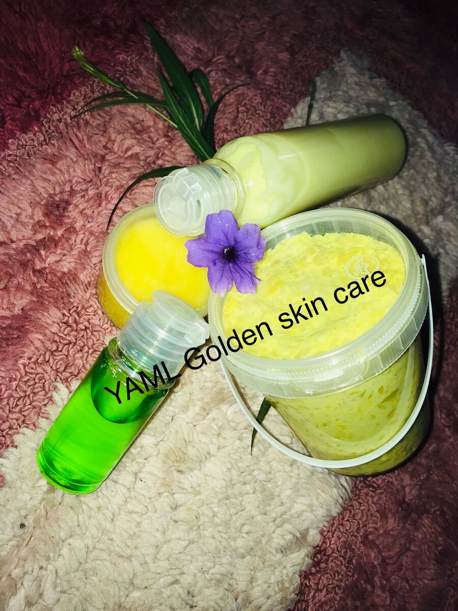 Découvrez notre kit complet de soins corporels YAML Golden Skin Care pour une peau éclatante ,uniforme et sans tâche. Comprend savon, pommade, gommage et lotion, conçus pour offrir une sensation de fraîcheur et de propreté à votre peau.